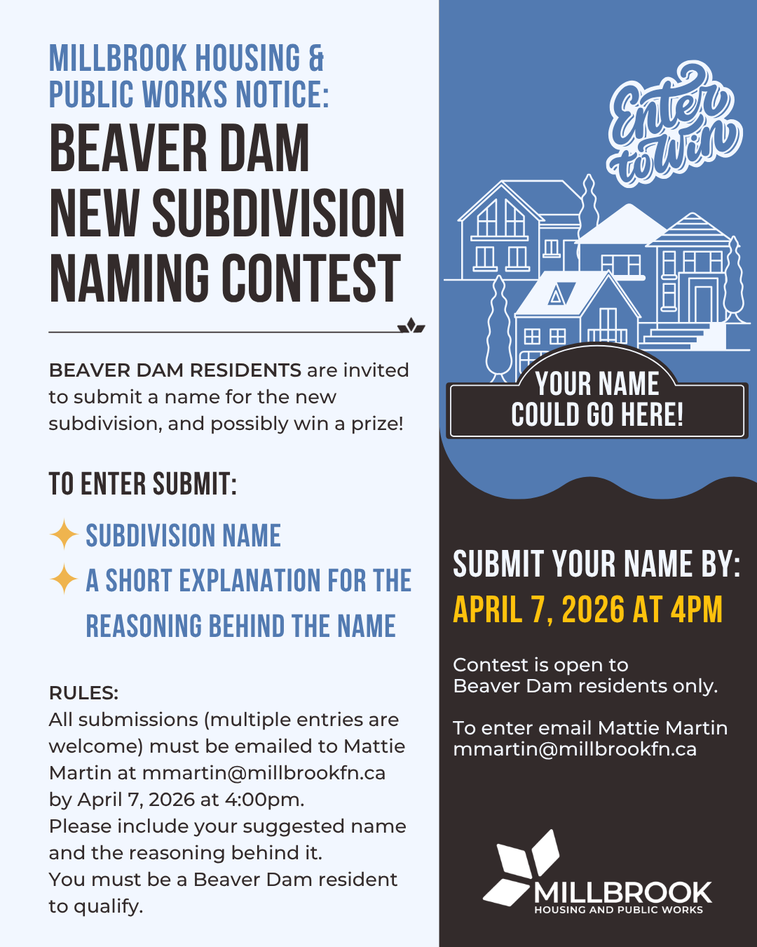 All submissions (multiple entries are welcome) must be emailed to Mattie Martin at mmartin@millbrookfn.ca by April 7, 2026 at 4:00pm.